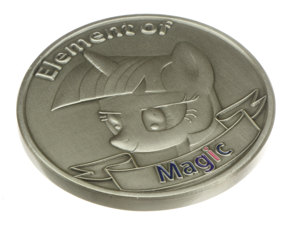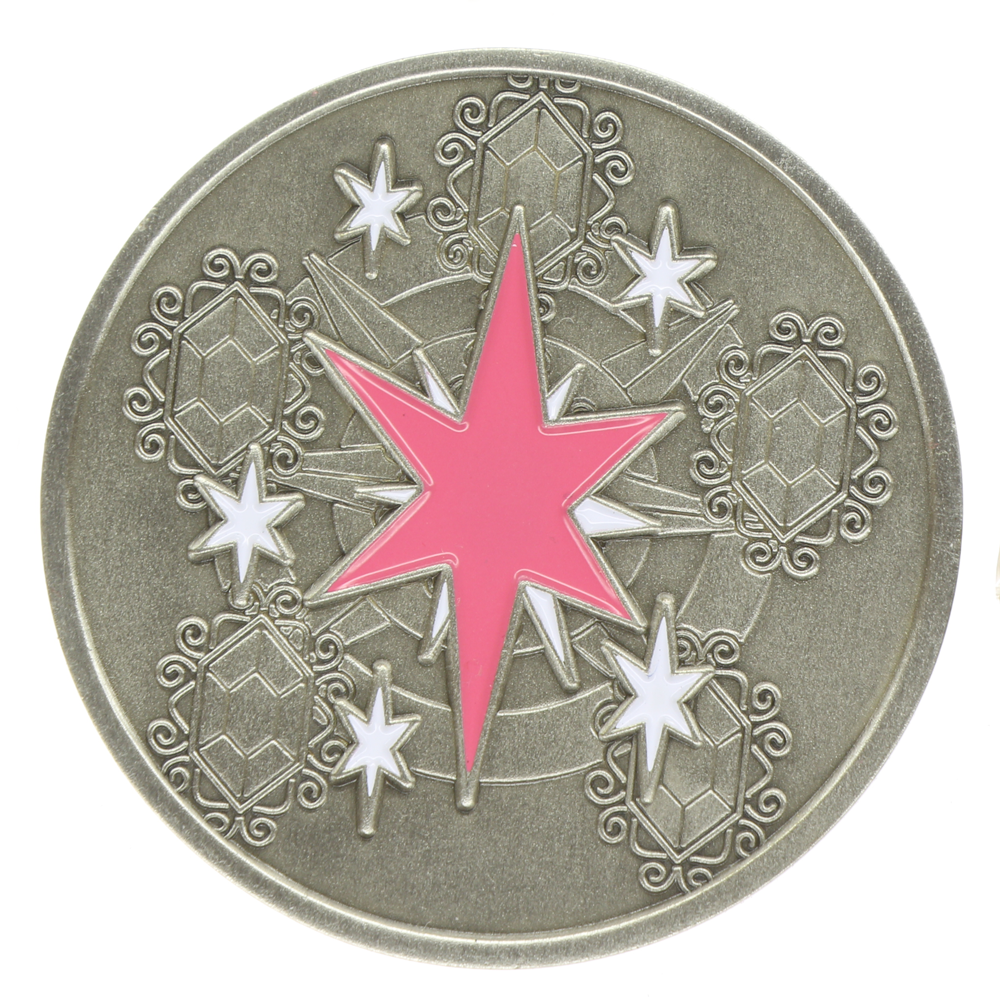 1.75" Diameter antiqued silver coin. On the front is Twilight Sparkle, element of magic, and on the back is her cutie mark with the elements of harmony in the background.