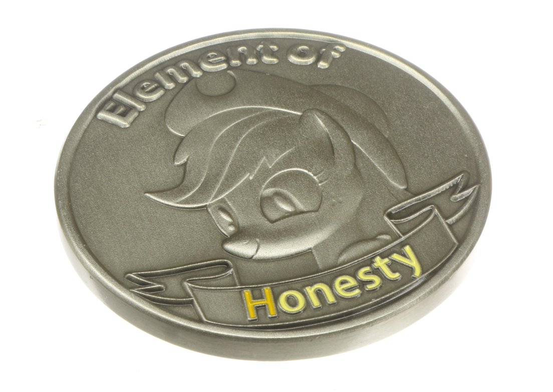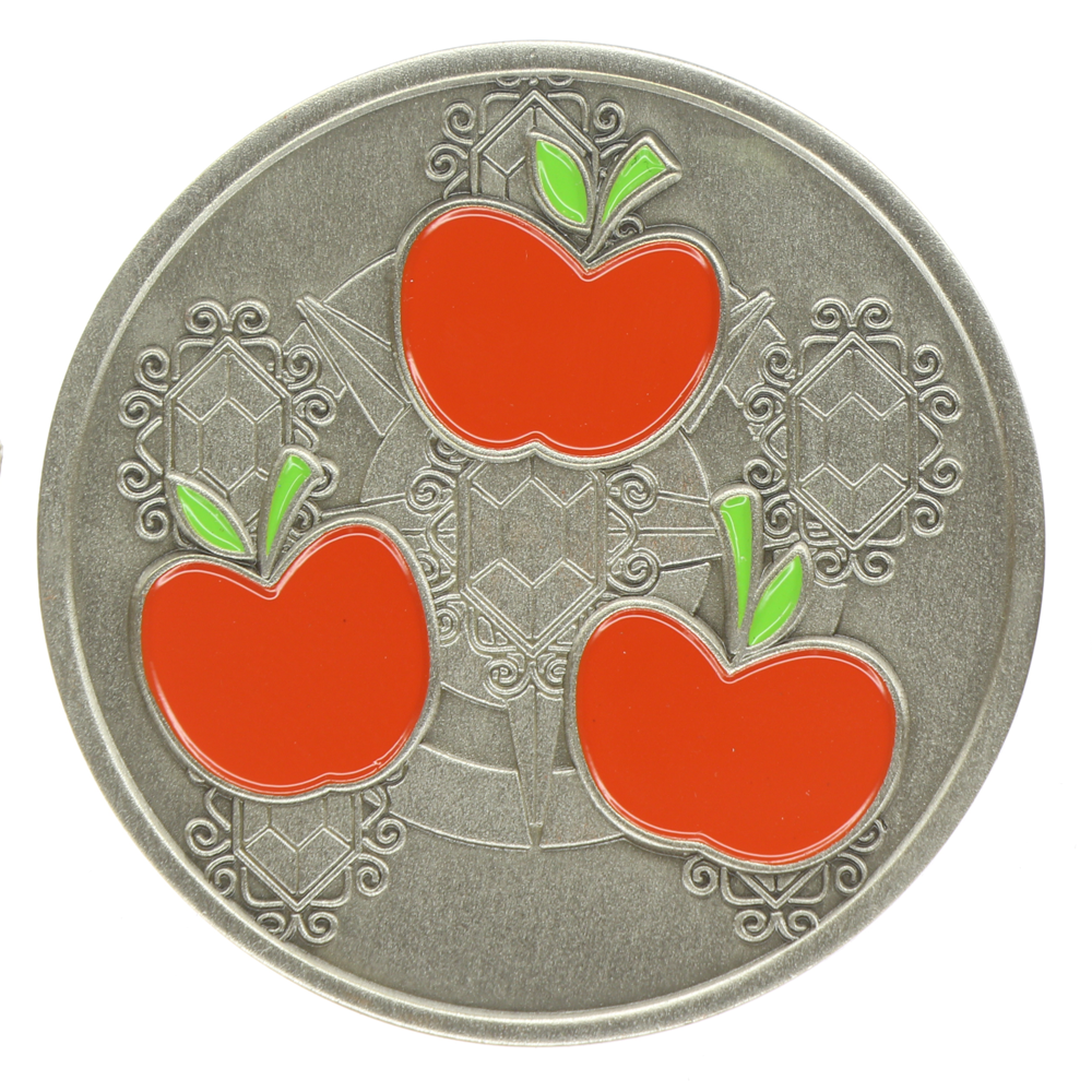 1.75" Diameter antiqued silver coin. On the front is Applejack, element of honesty, and on the back is her cutie mark with the elements of harmony in the background.