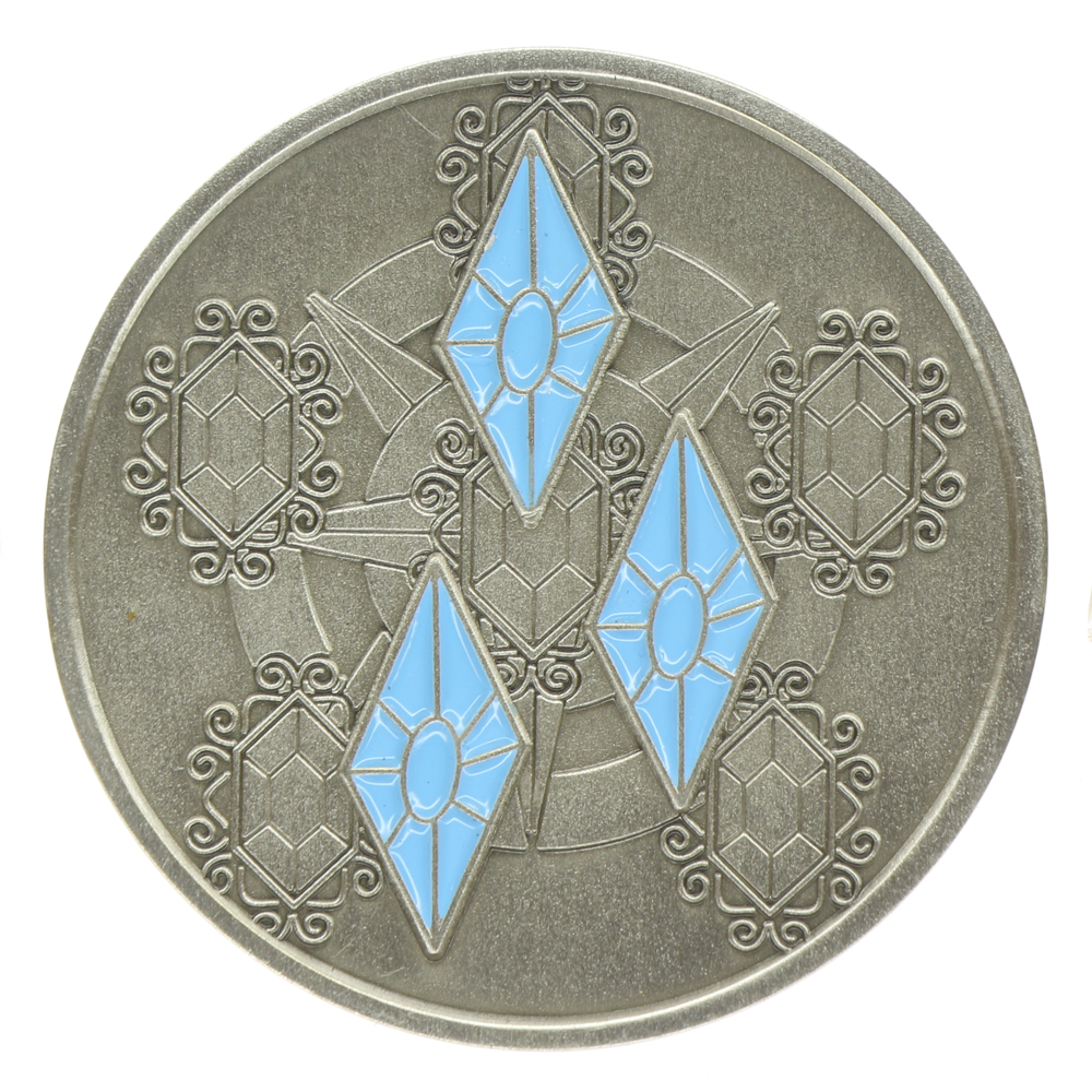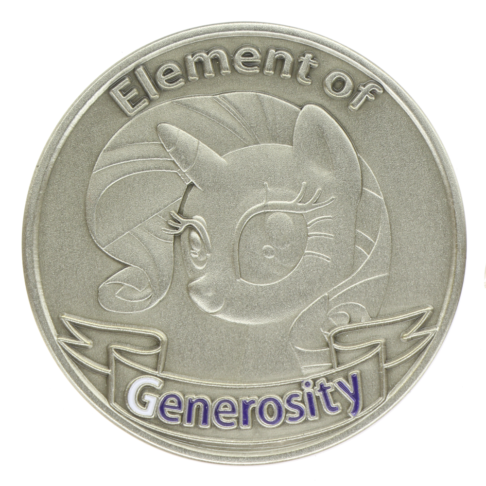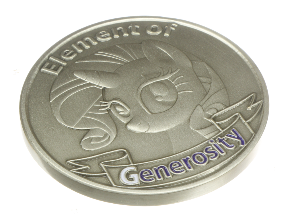1.75" Diameter antiqued silver coin. On the front is Rarity, element of generosity, and on the back is her cutie mark with the elements of harmony in the background.